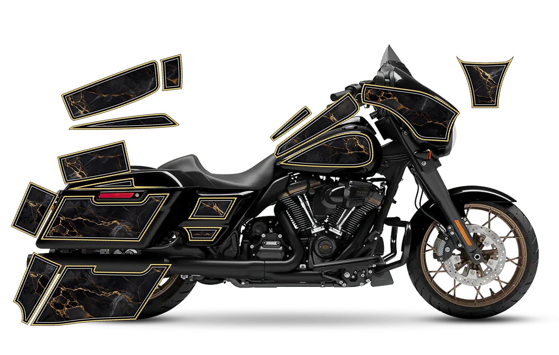 Upgrade your Street Glide with our Geo Graphics kit. Designed with a sleek marble pattern allowing the character and depth of the graphics to take the stage, while the inner pinstriping accents the characteristics of its background. Completing the look for a life like finish, we've added an engine turn style foil pattern to all the borders making this design an absolute head turner. Designed to align visually from panel to panel to create a continuous flow from nose to tail, you will leave everyone guessing "is that painted?". Choose from a variety of color options both Metallic and Non-Metallic, that fit your style. All of our kits are laminated in a high gloss wrap overlaminate film for protection, longevity, and most of all that "wet paint" finish. The Geo kit is integrated to fit both Standard and CVO Extended Bags, as well as bag lids both with, and without speakers. So, choosing the right kit is easier than ever. This kit includes all the panels you need no matter which sub model you have.